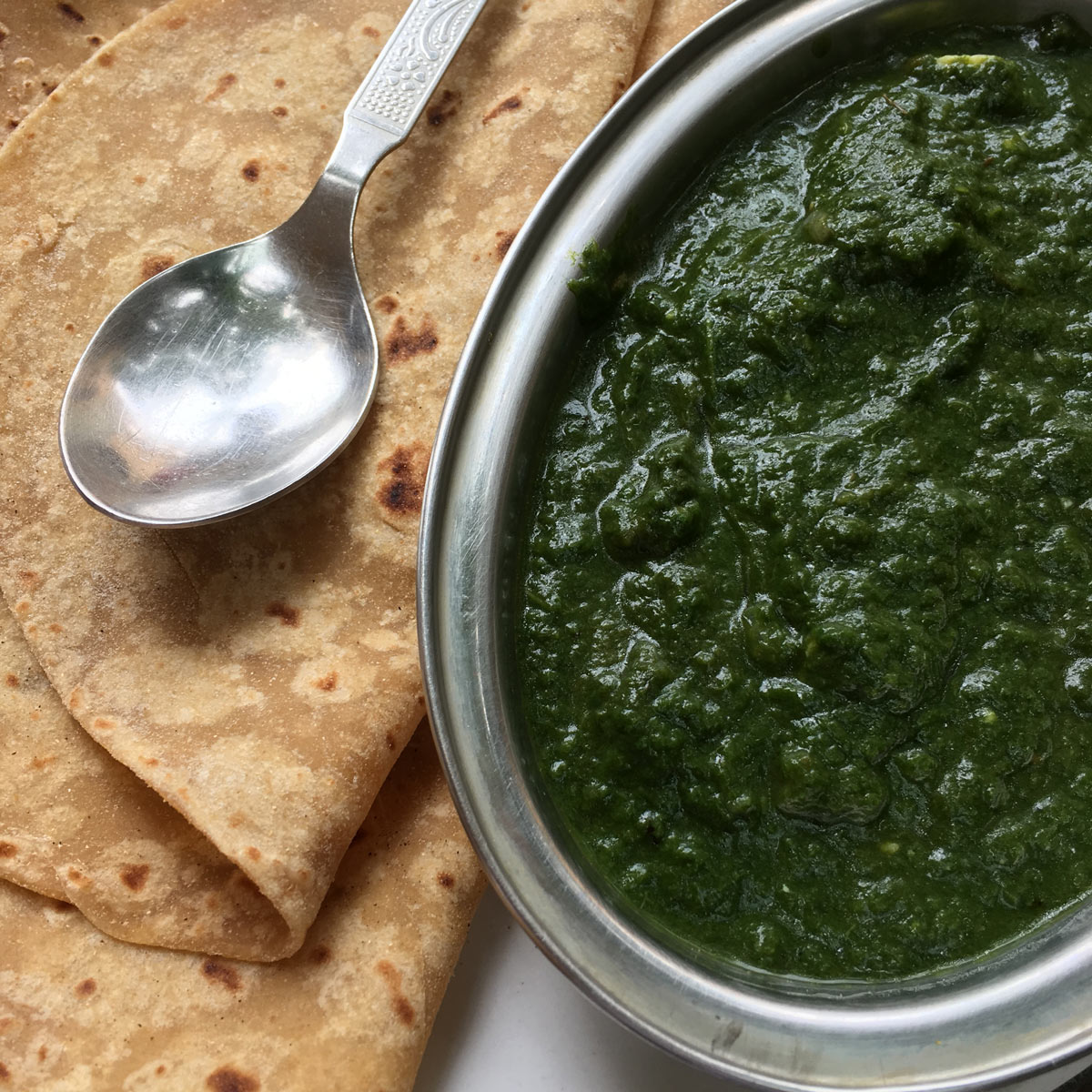 Colourful green spinach and paneer sit in an oval silver bowl, alongside folded roti. A silver spoon sits waiting on the roti.