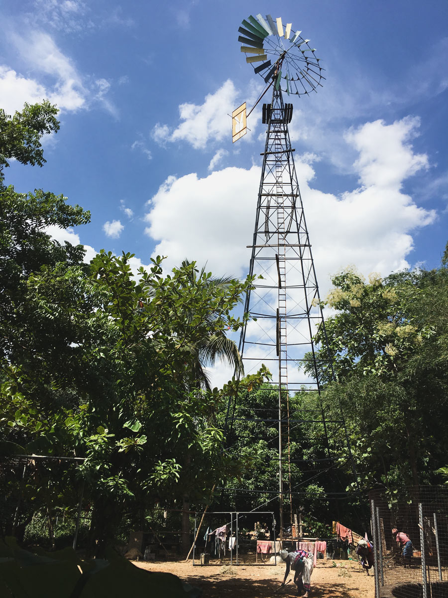 Karen Anderson strides past the entrance to Solitude Farms in Auroville, South India.