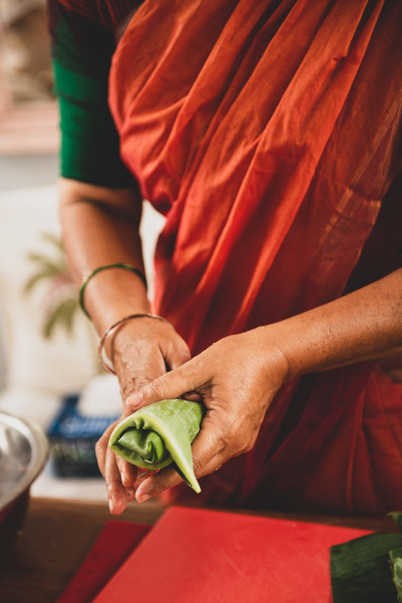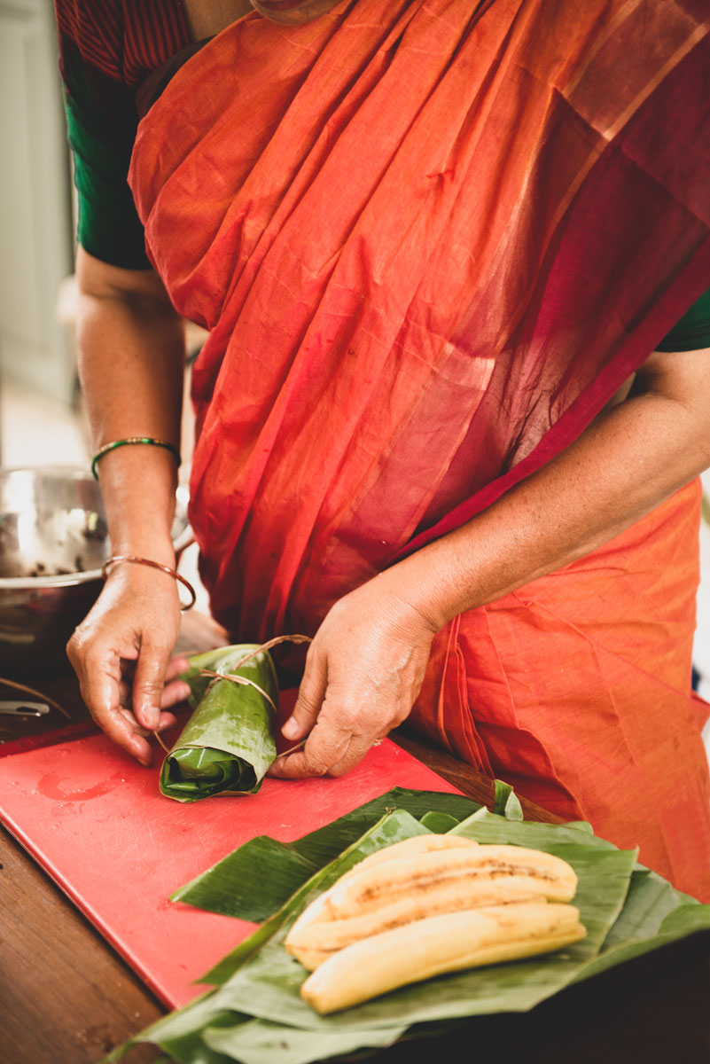 Anita wearing a burnt orange sari making banana leaf dessert.
