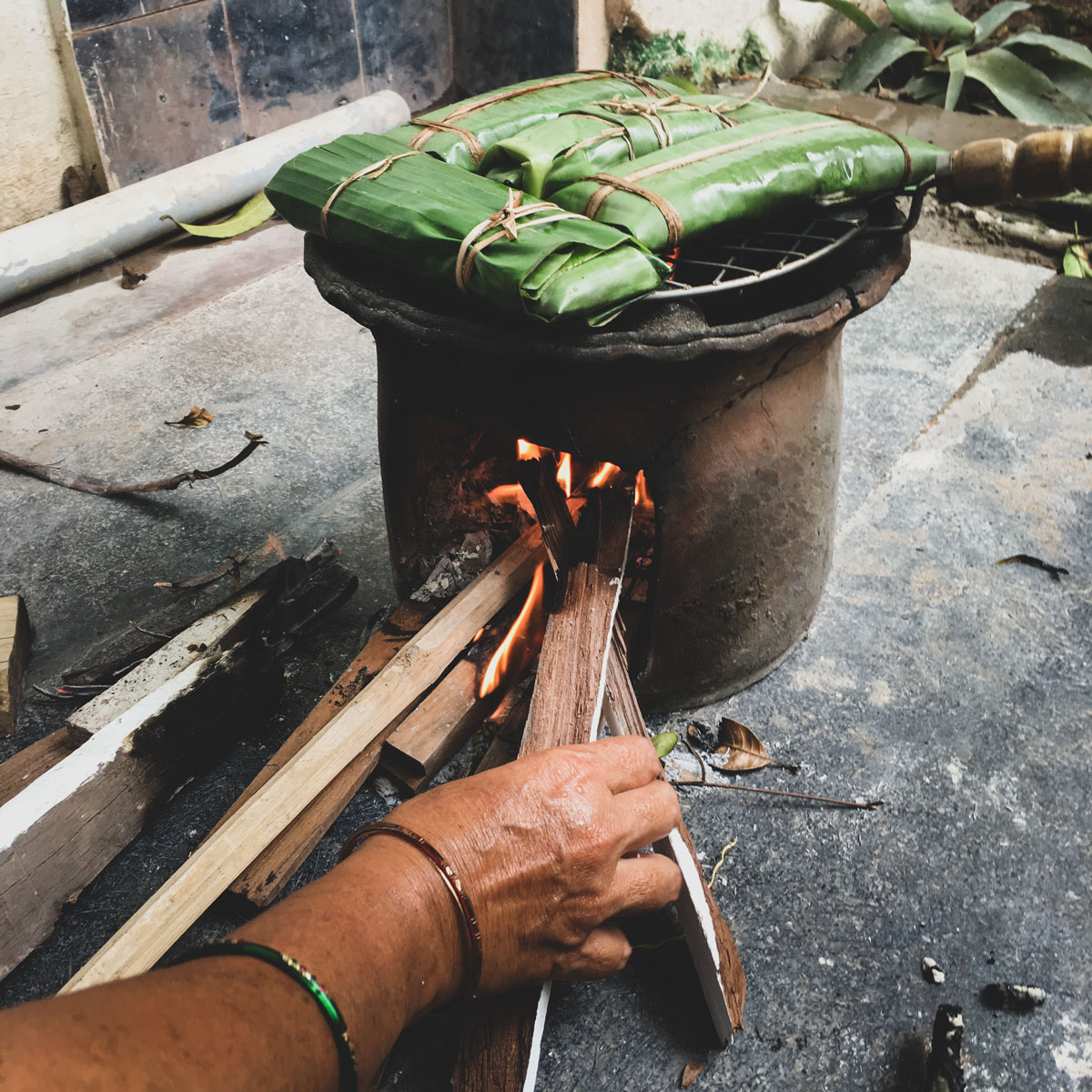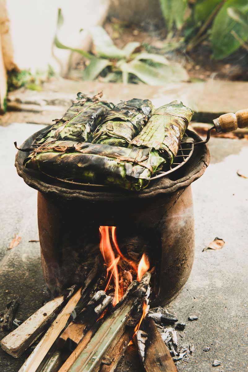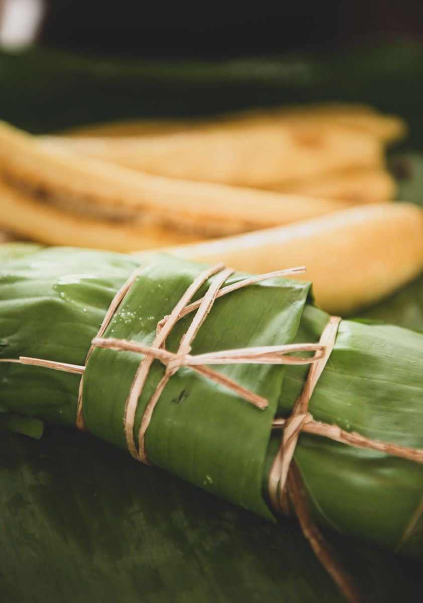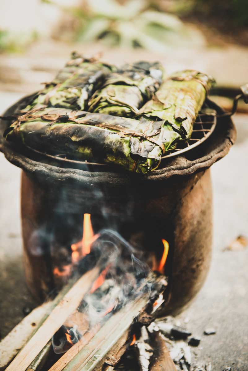 Bananas and sticky rice are wrapped in a banana leaf then roasted over a wood fire.