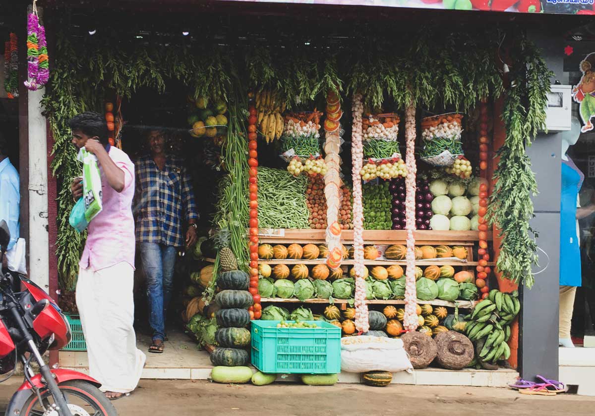 Neatly stacked fruits and vegetables on display in Kerala, South India.