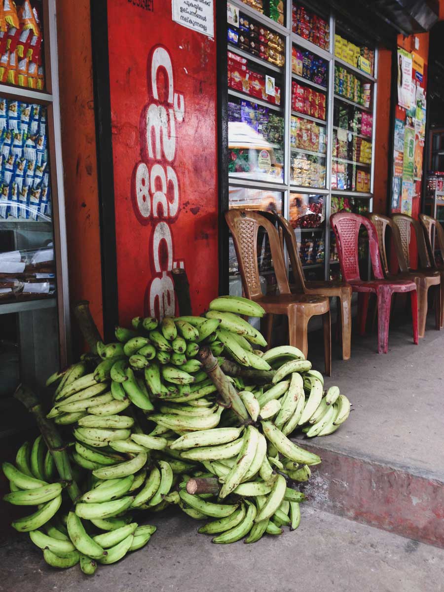 A massive bunch on bananas sit on the sidewalk outside the Mariya Family Restaurant