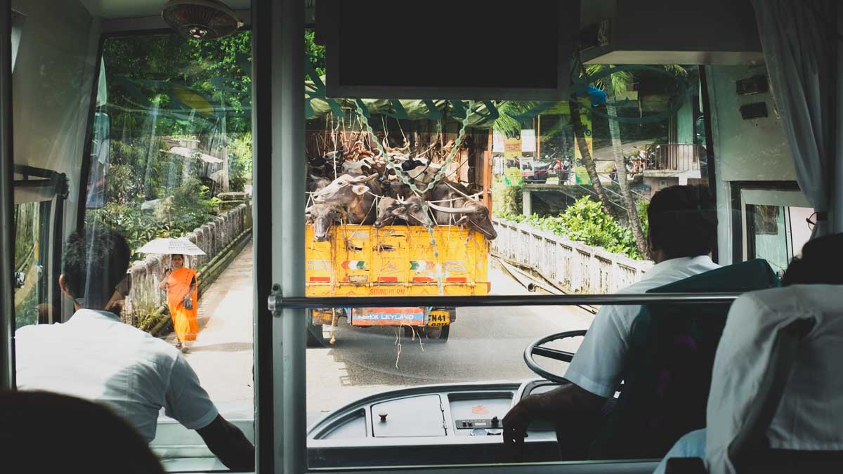 An open truck full of cattle trundles down a South Indian road.