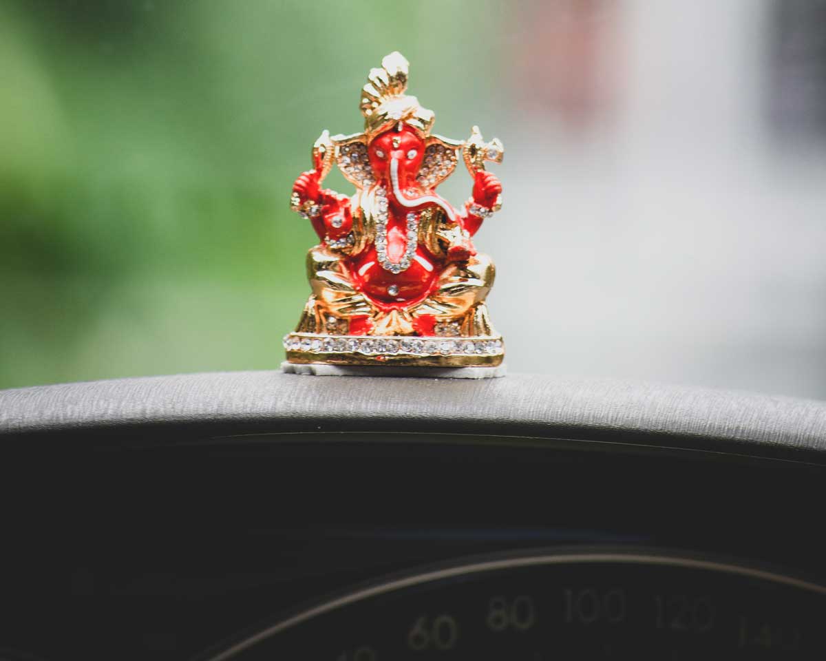 Ganesh oversees safe travels on the car dashboard.