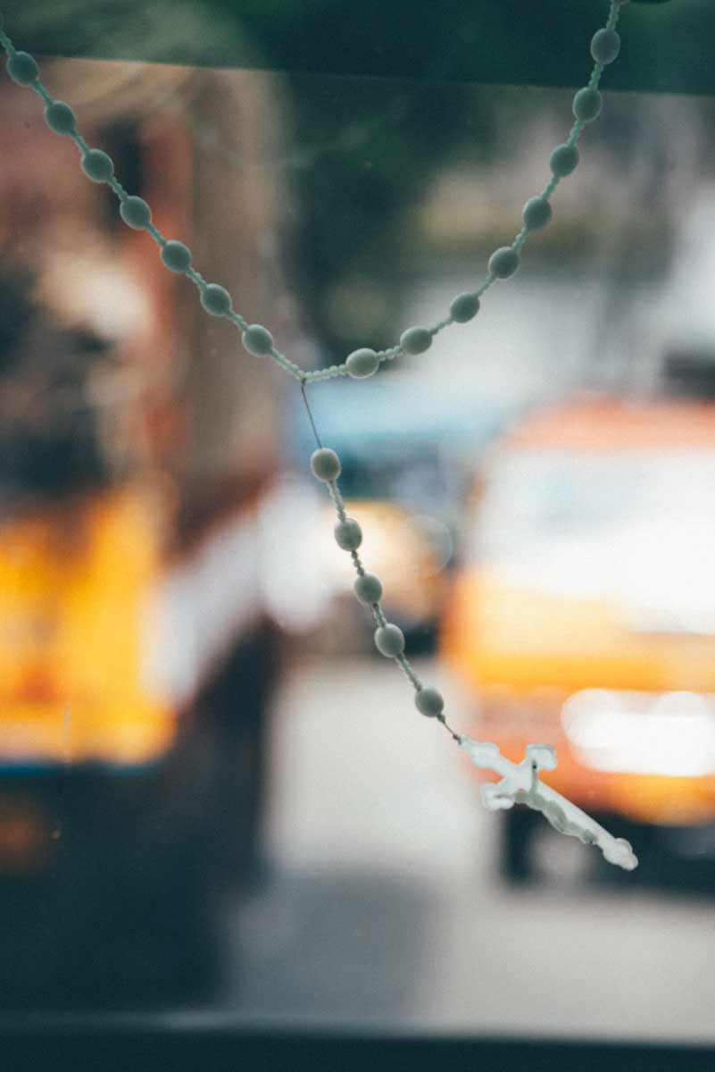 A rosary swings from the rear view mirror of a South Indian tour bus.