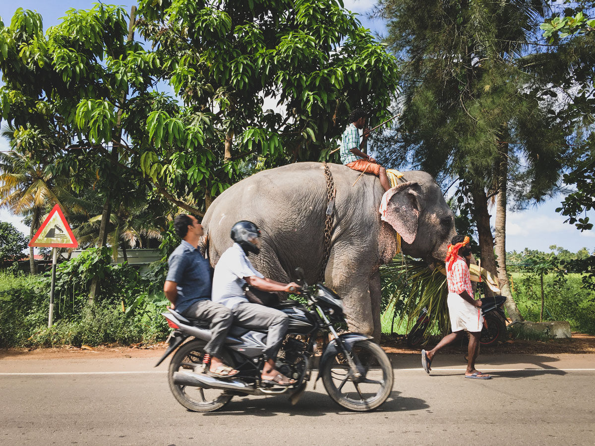An elephant and a double on motorbike pass by on a South Indian roadway.