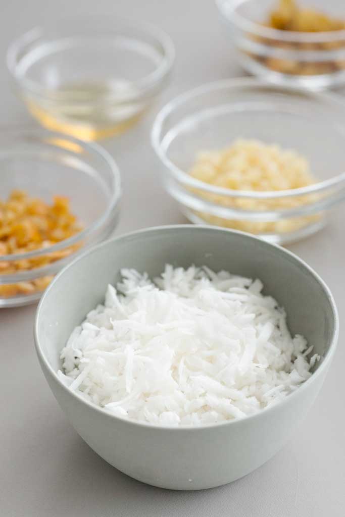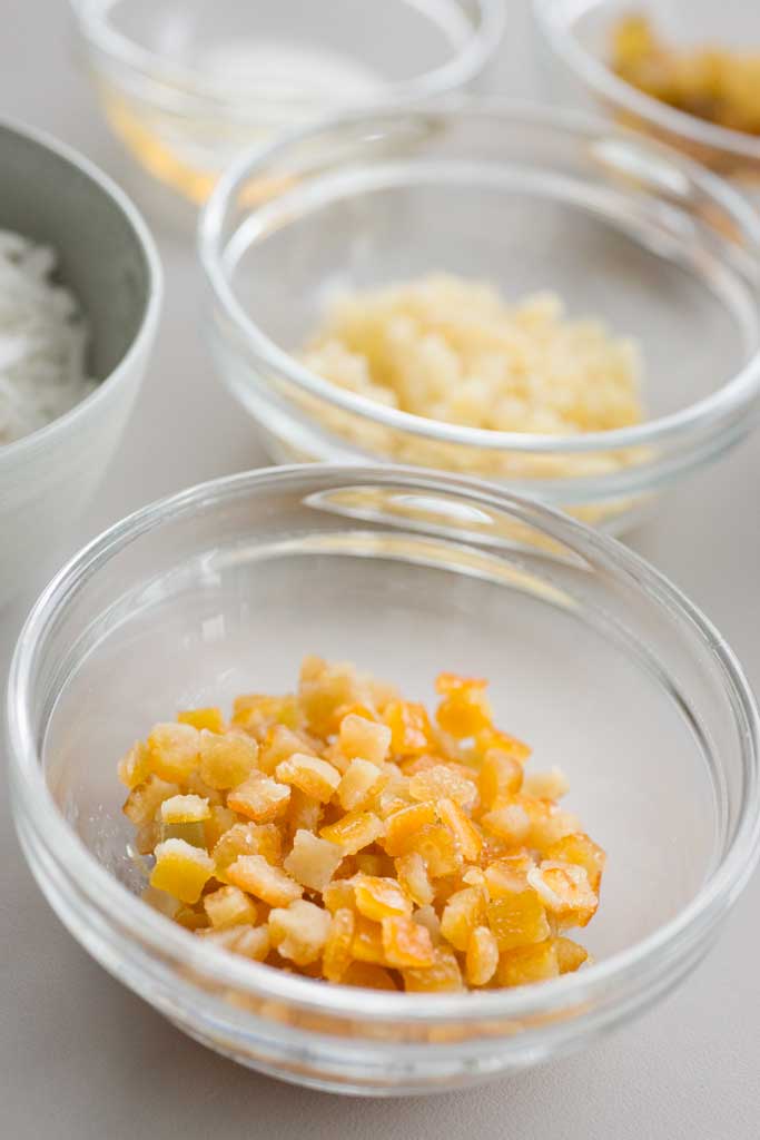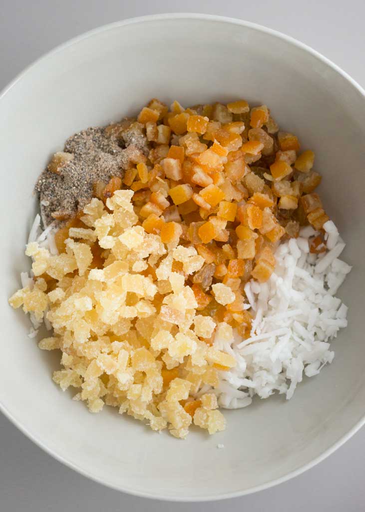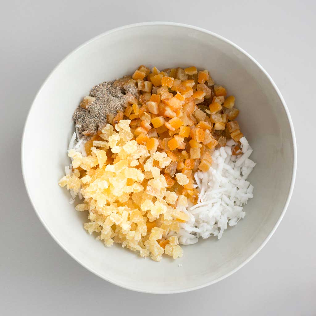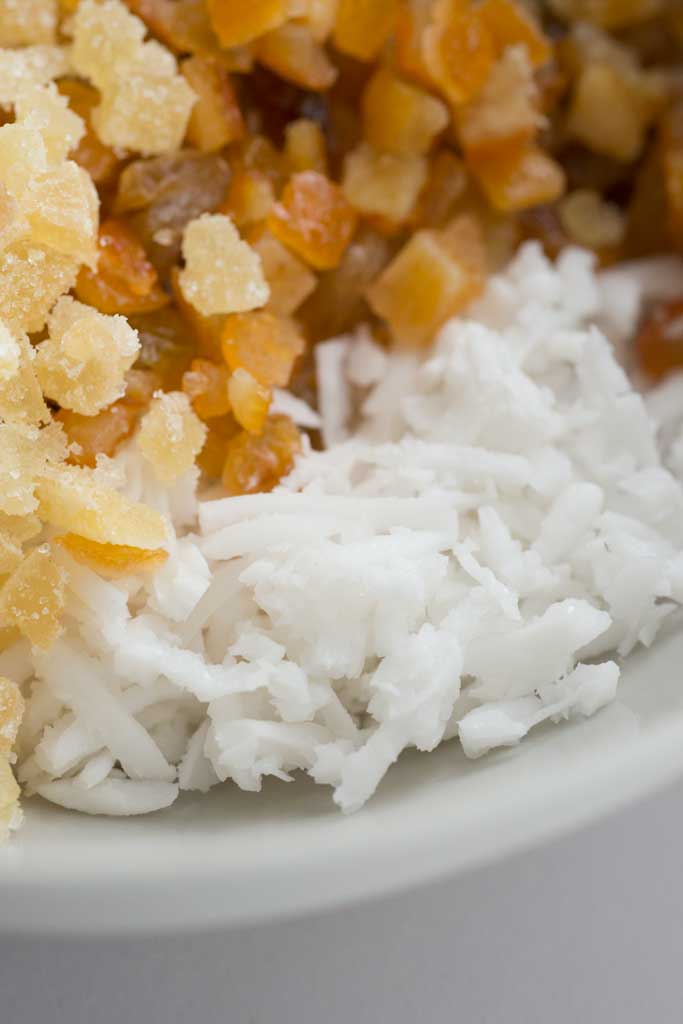 Coconut, candied ginger and citrus peel filling.