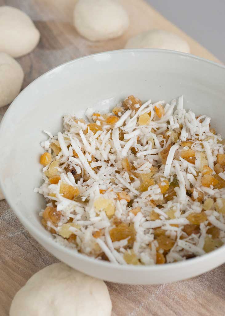 Coconut buns with candied ginger and citrus peel.
