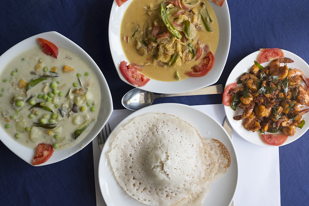 Hotel Casa Linda, Kochi, Kerala. Clockwise from the top: Fish Molee, Susheela’s coconut prawns, appams, Ishtoo (vegetable stew).