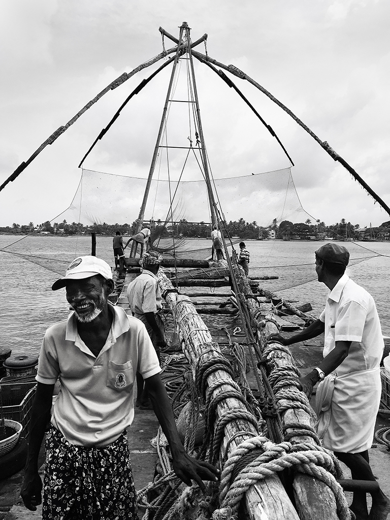 Fishermen working Chinese fishing nets, Fort Kochi, Kerala.
