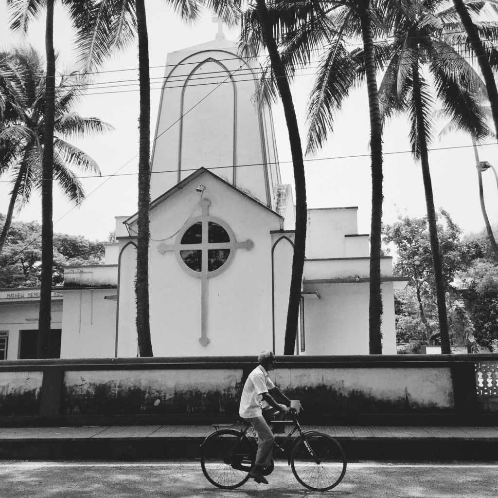 Christian church and cyclist, Kochi, Kerala.