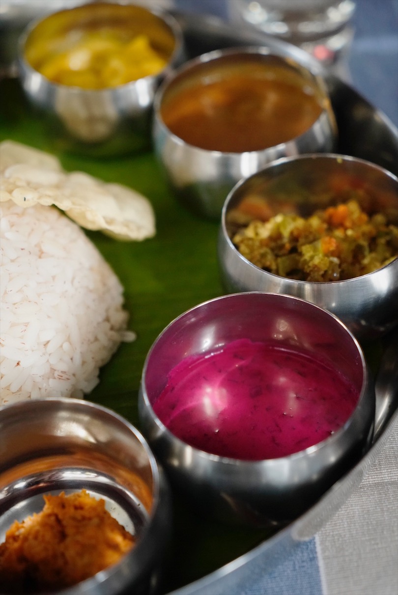 A multi-course South Indian thali lunch presented on a banana leaf.
