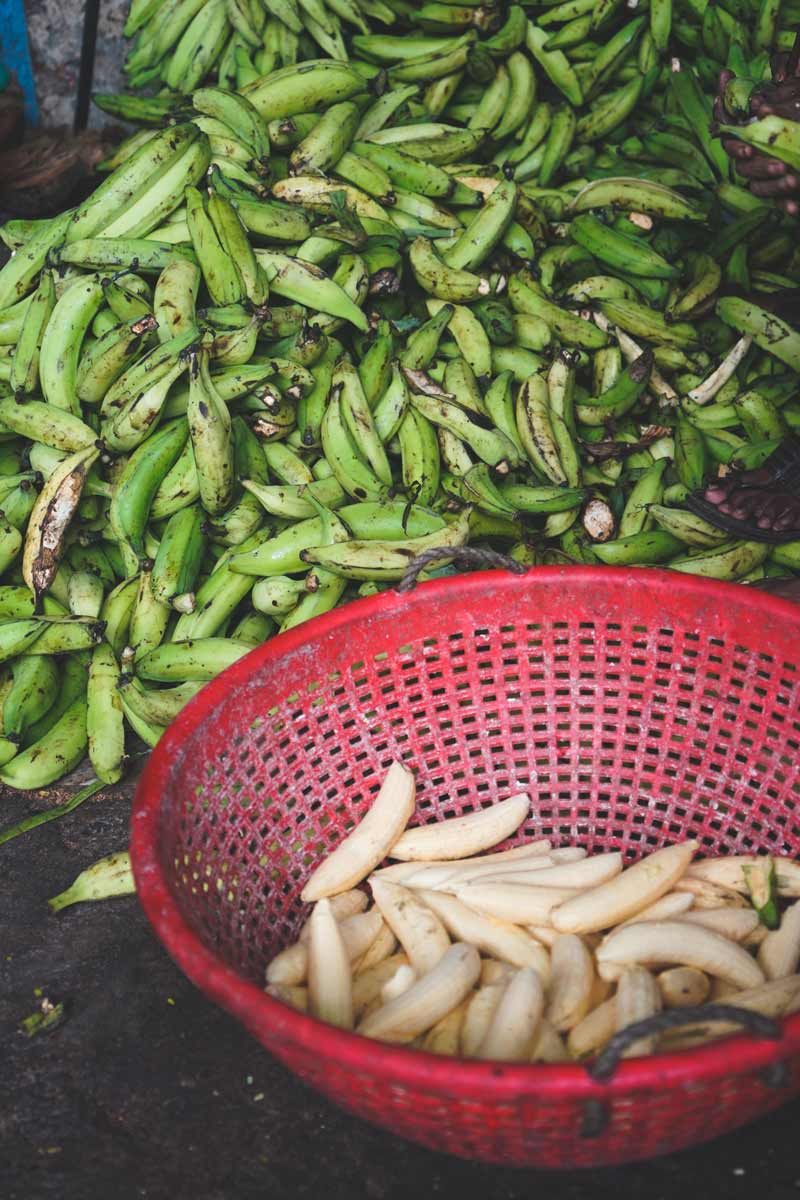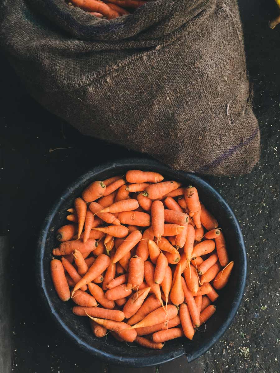 Small orange carrots in a bowl beside a sac.