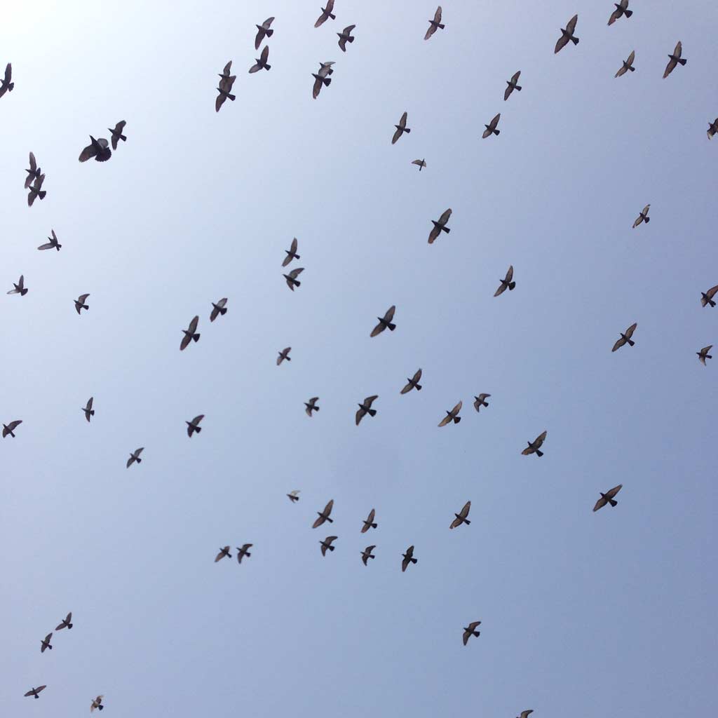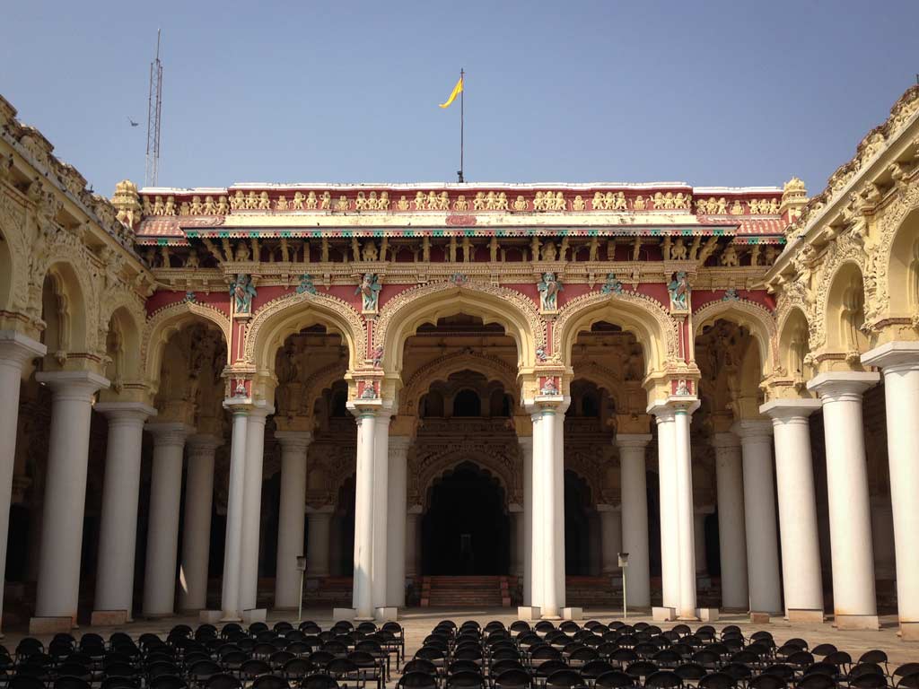 Birds fly over the Nayakar Mahal Palace courtyard.
