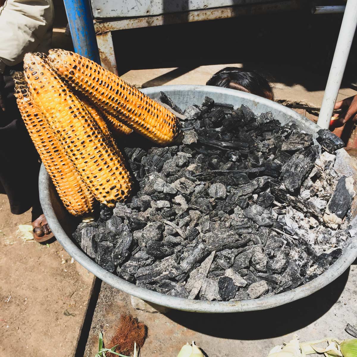 Grilled corn on charcoal.