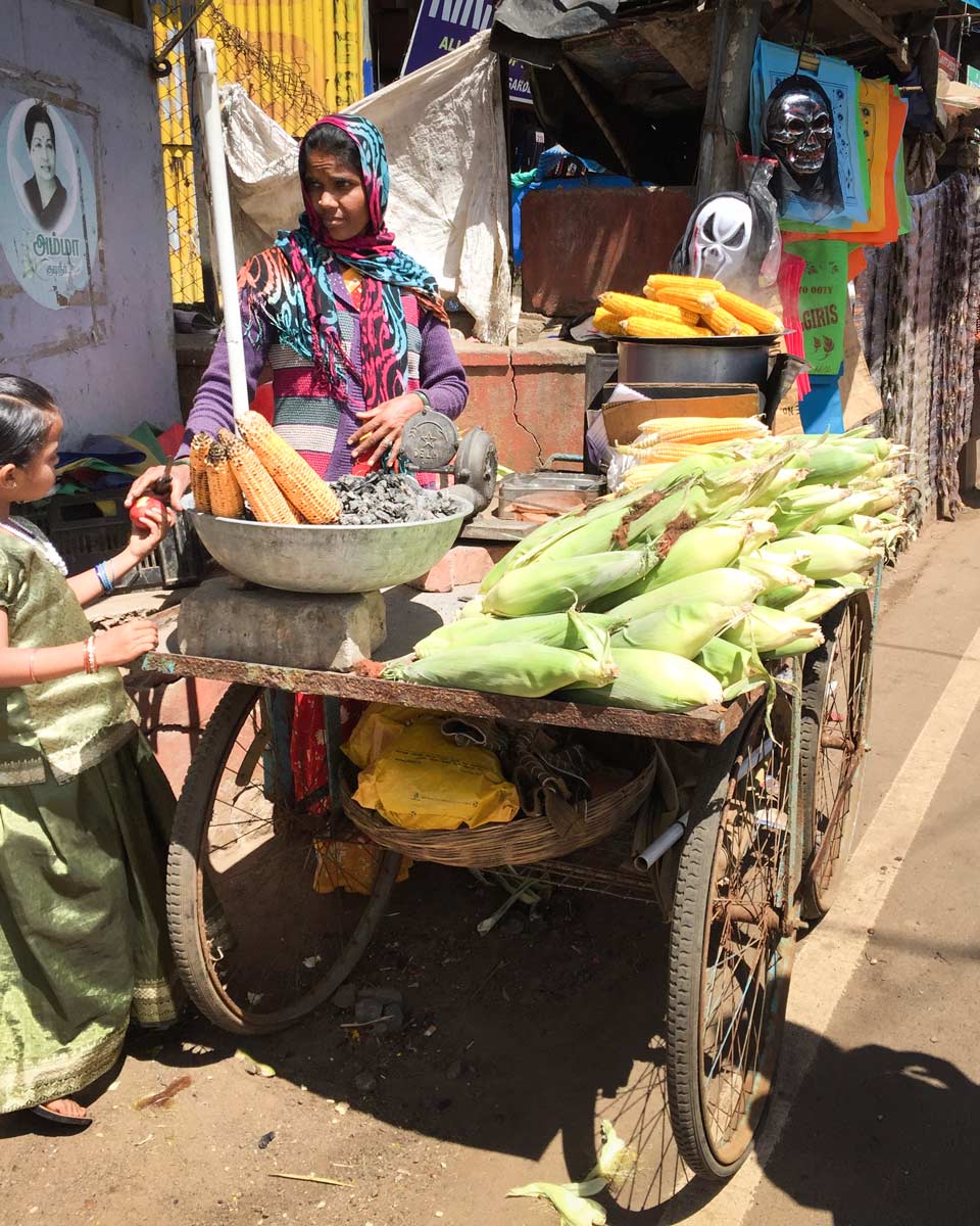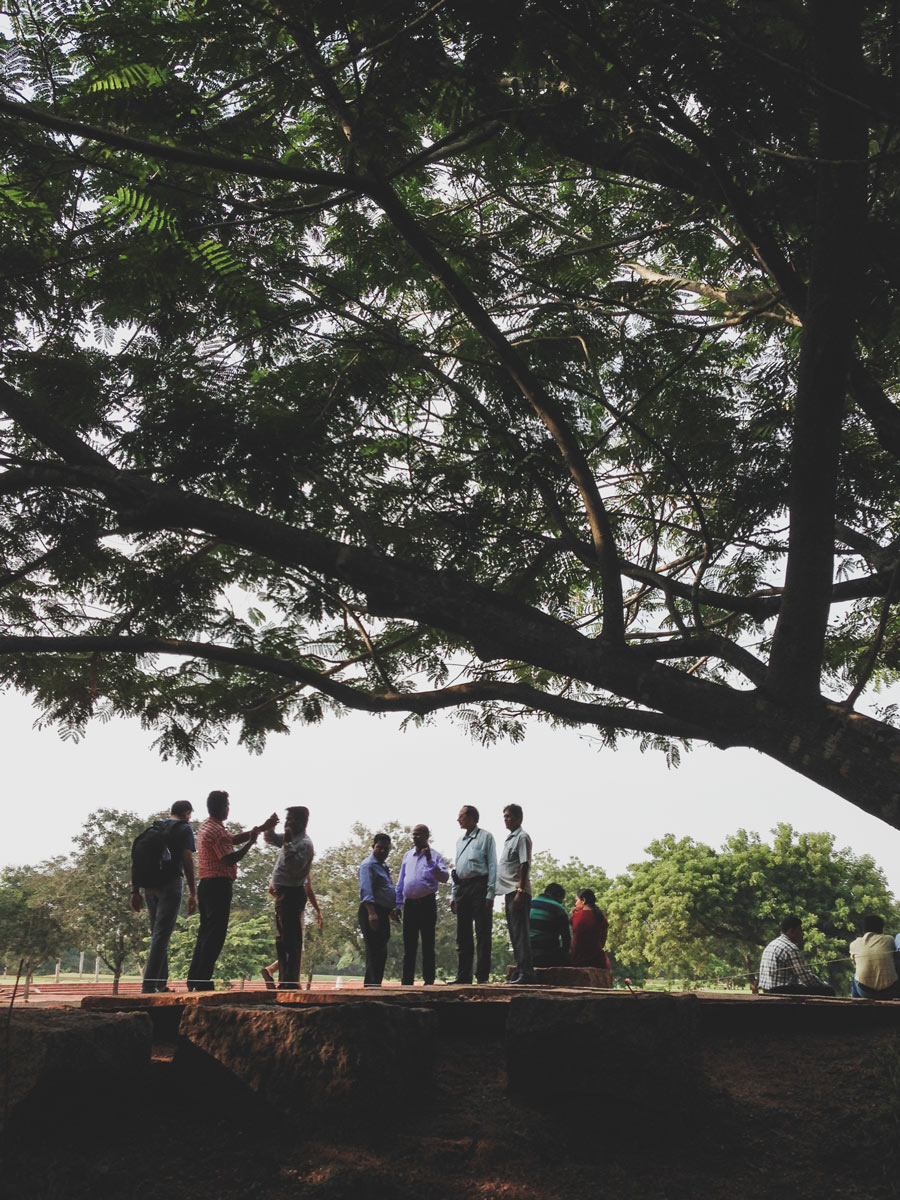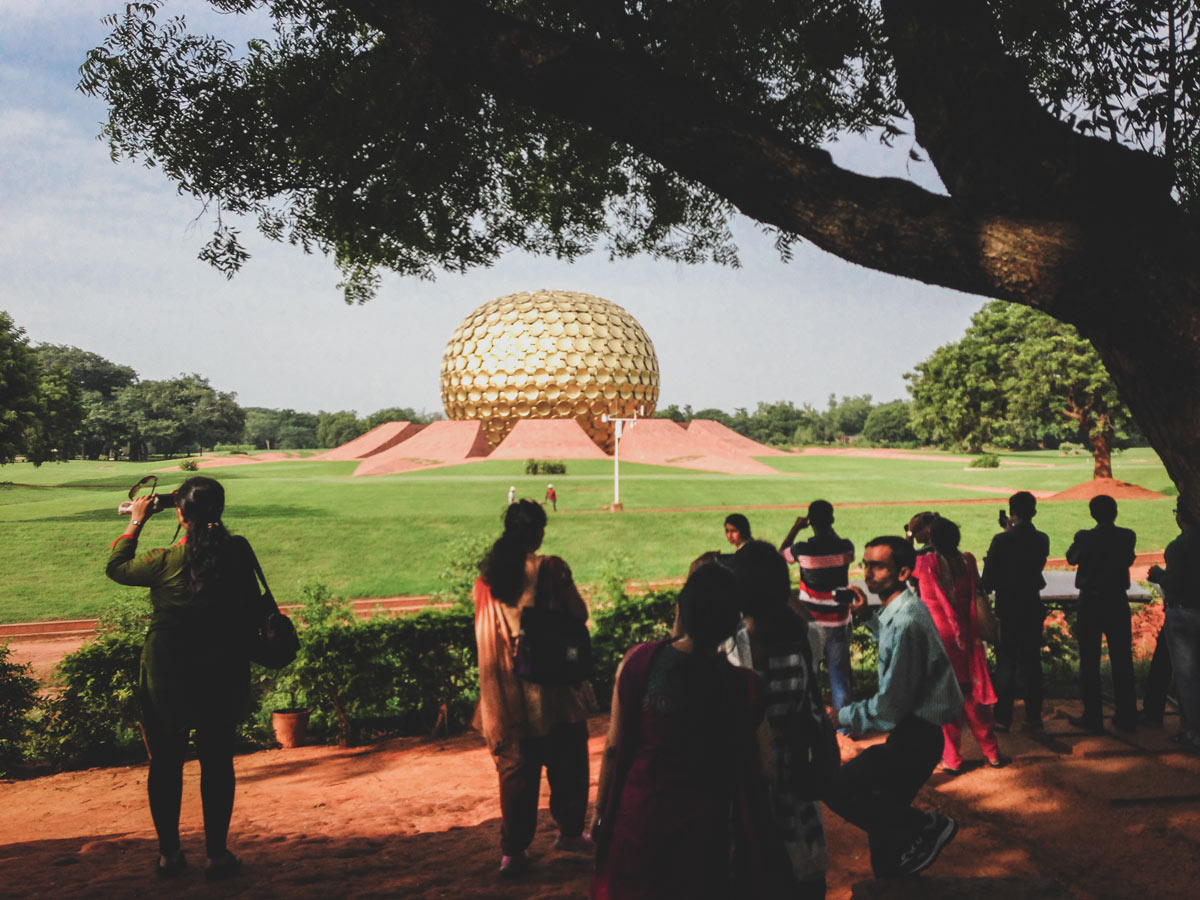 A crowd gathers under the shade of trees to observe the Matrimandir in Auroville.