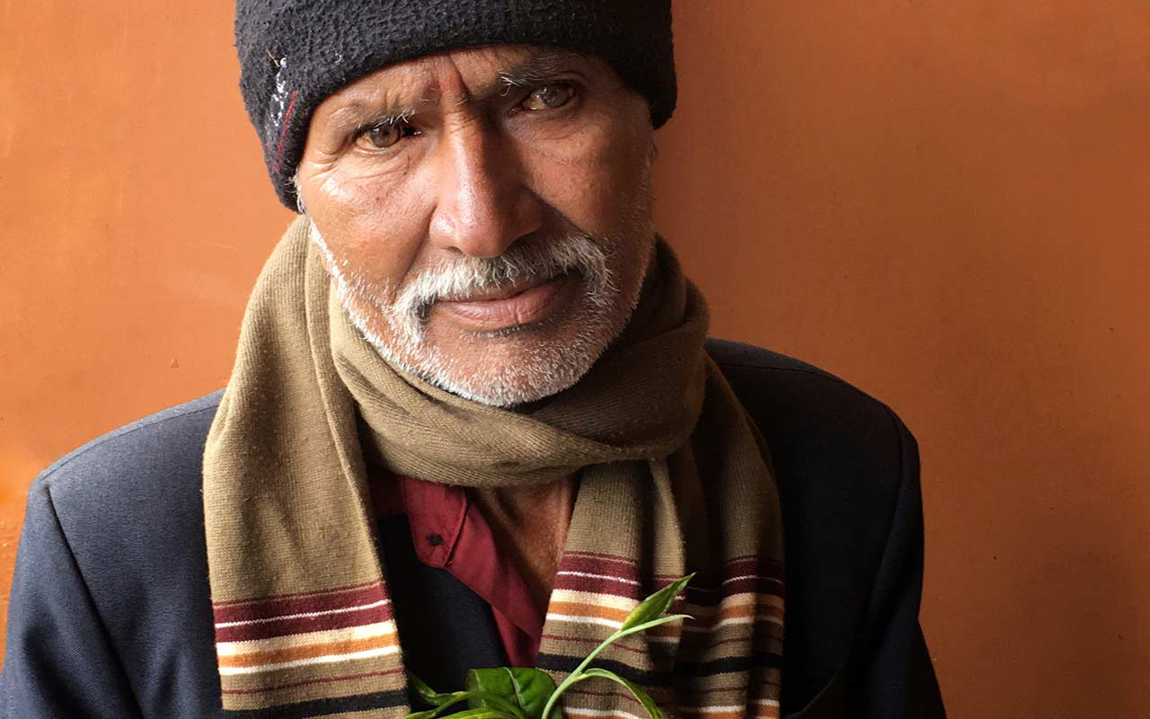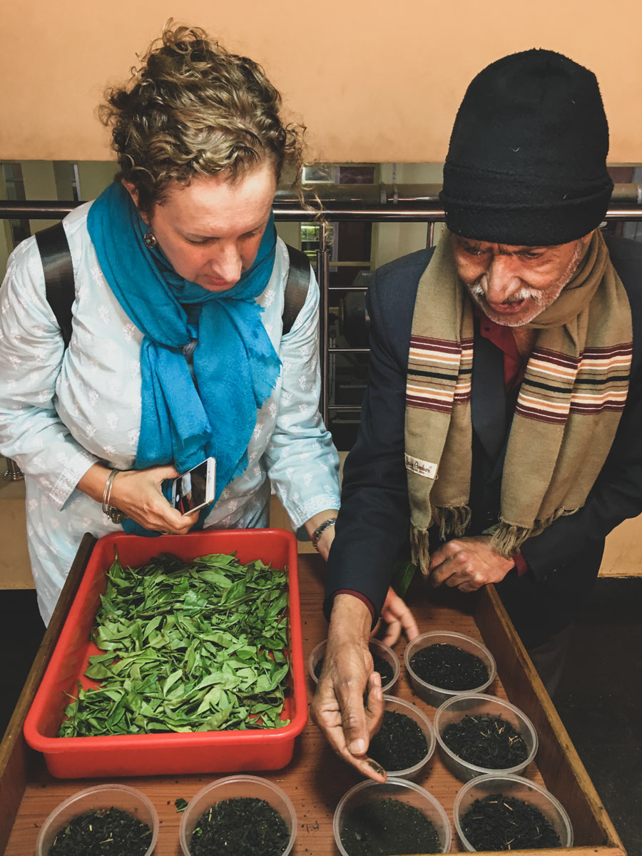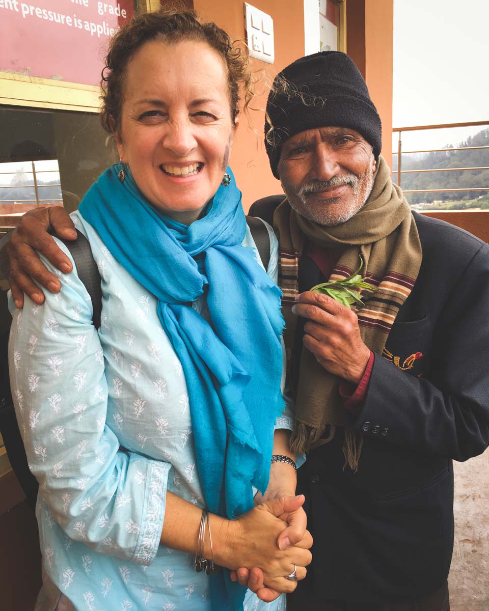 A crowd gathers under the shade of trees to observe the Matrimandir in Auroville.