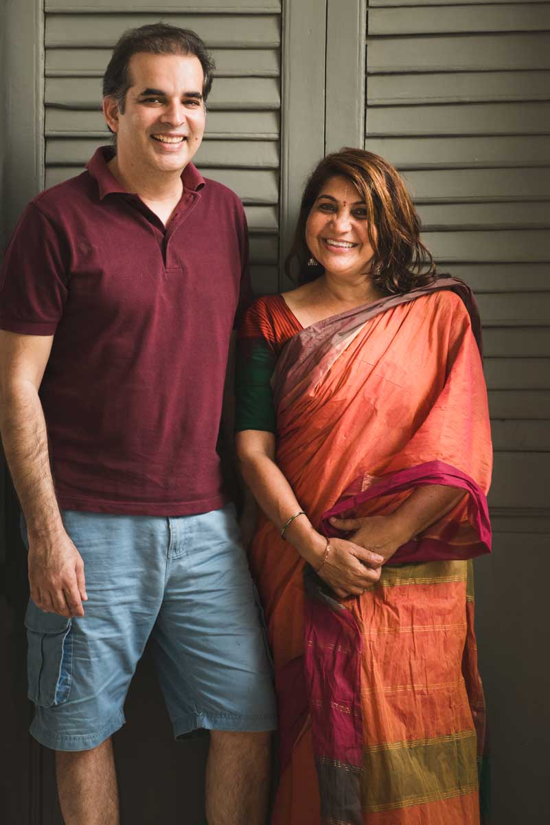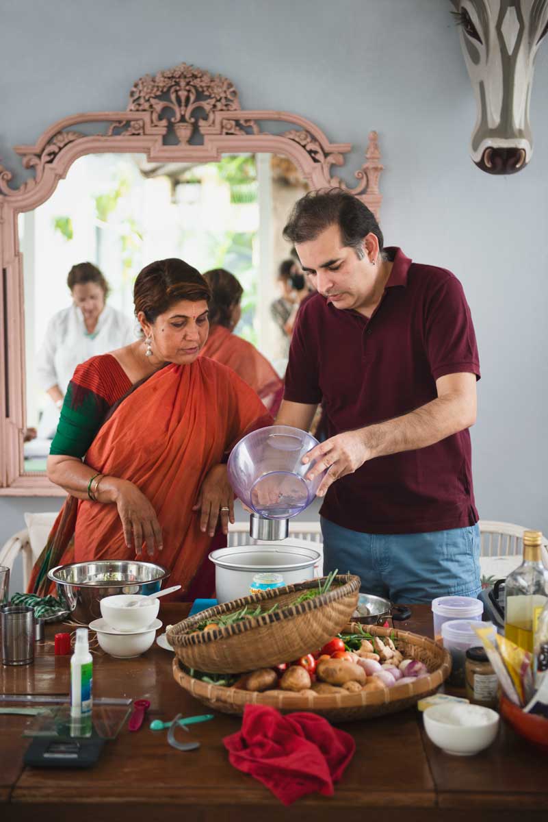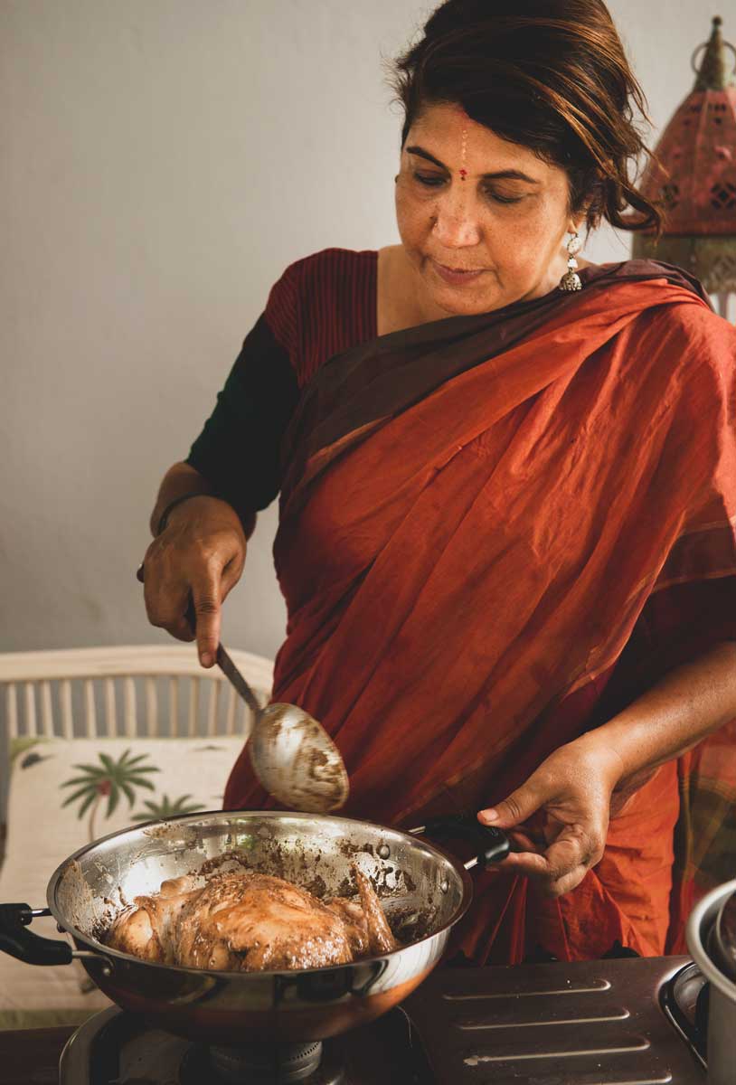 Sumeet with Anita wearing a burnt orange sari making poulet.