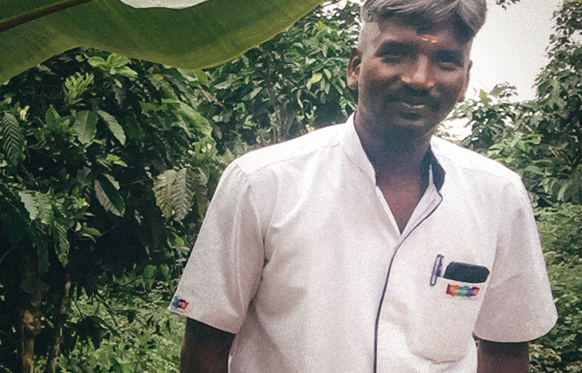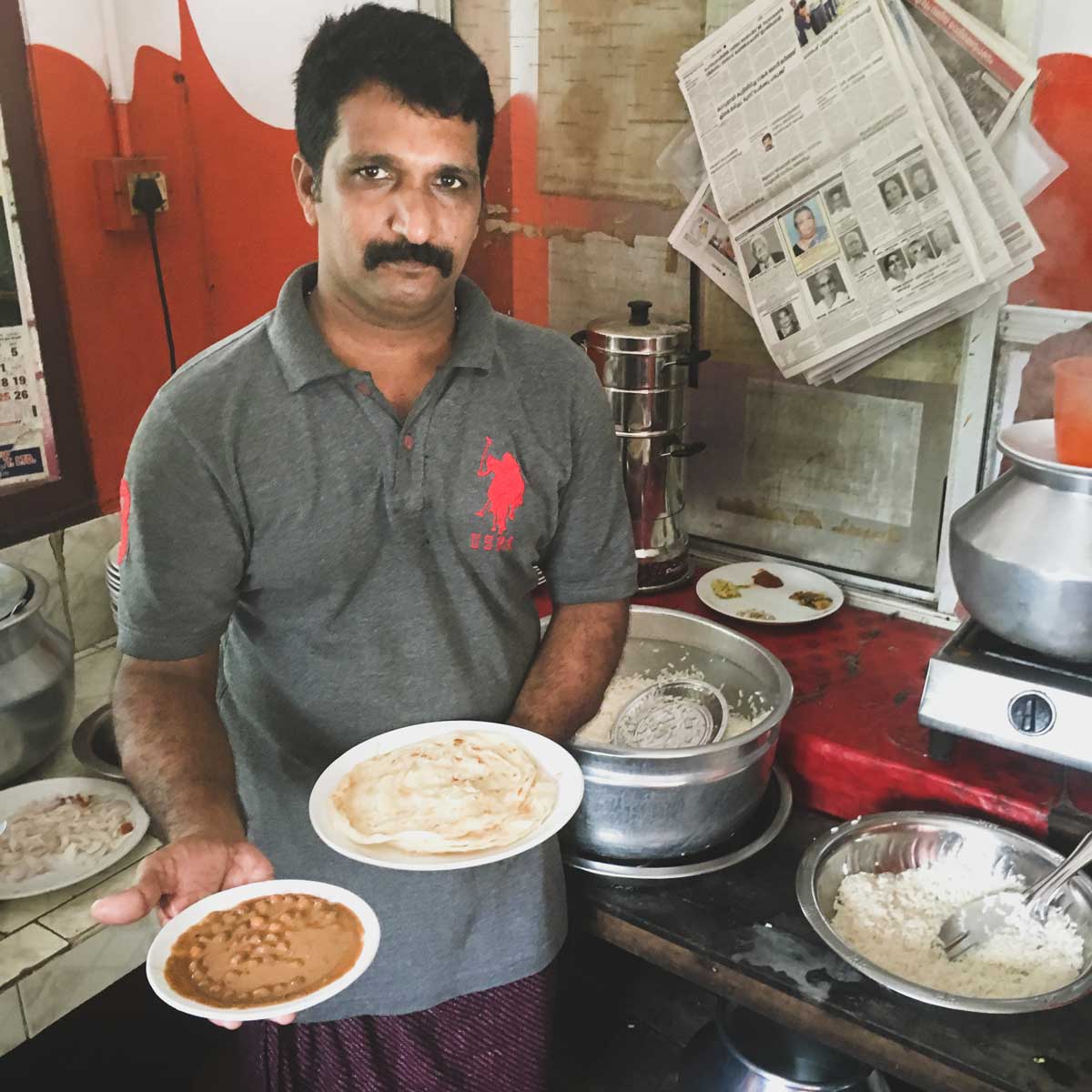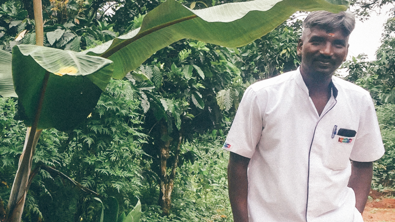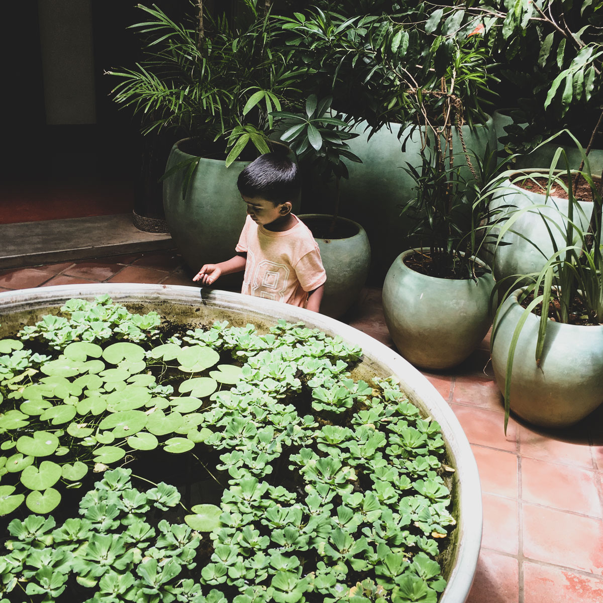 A boy plays on the edge of a lily-filled water feature at Maison Perumal.