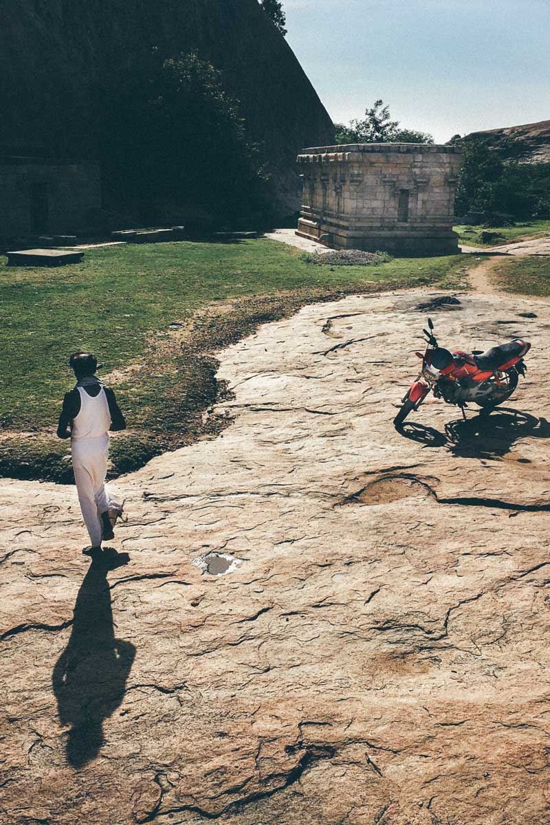 A quiet Shiva temple, and the priest’s red motorcycle.