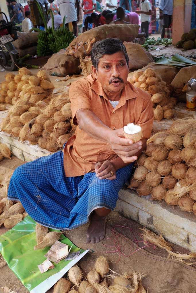 An offering of friendship in a vegetable market outside of Madurai.