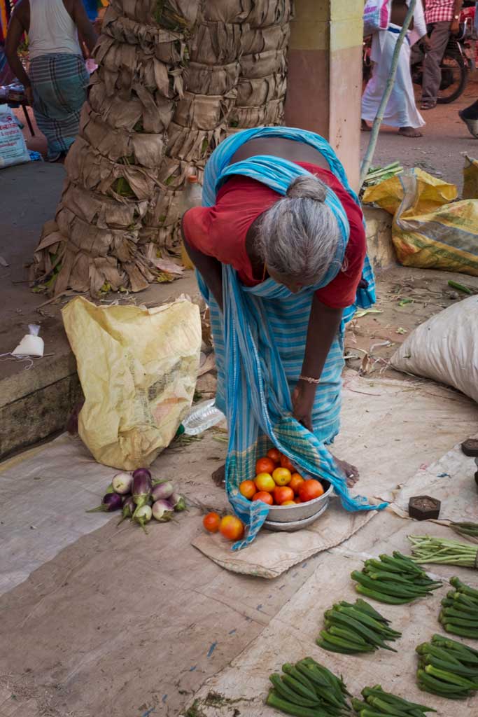 Red tomatoes meet blue sari at a vegetable market near Madurai.