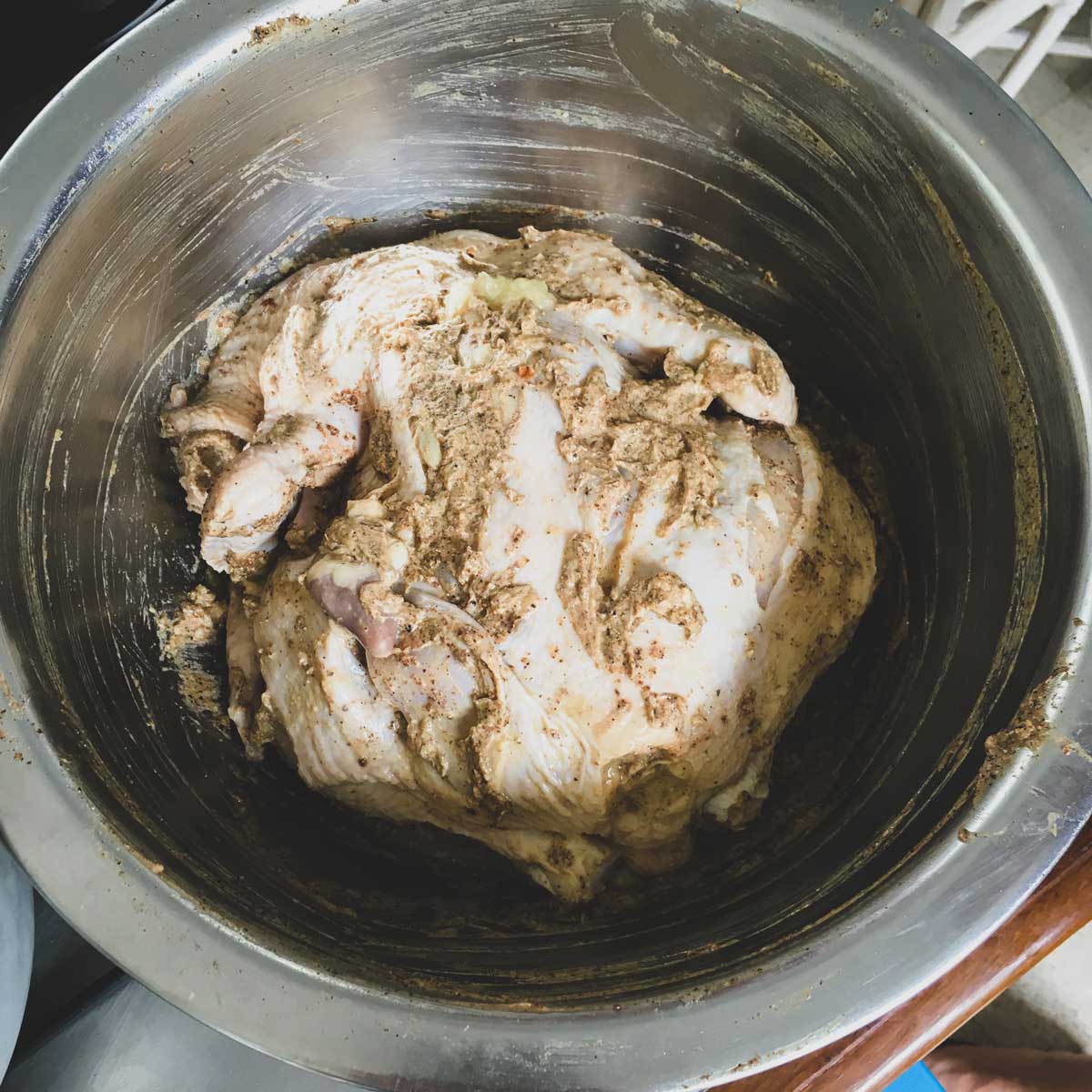 Poulet Rôti, browned skin looking delicious, is cut and prepared for serving.