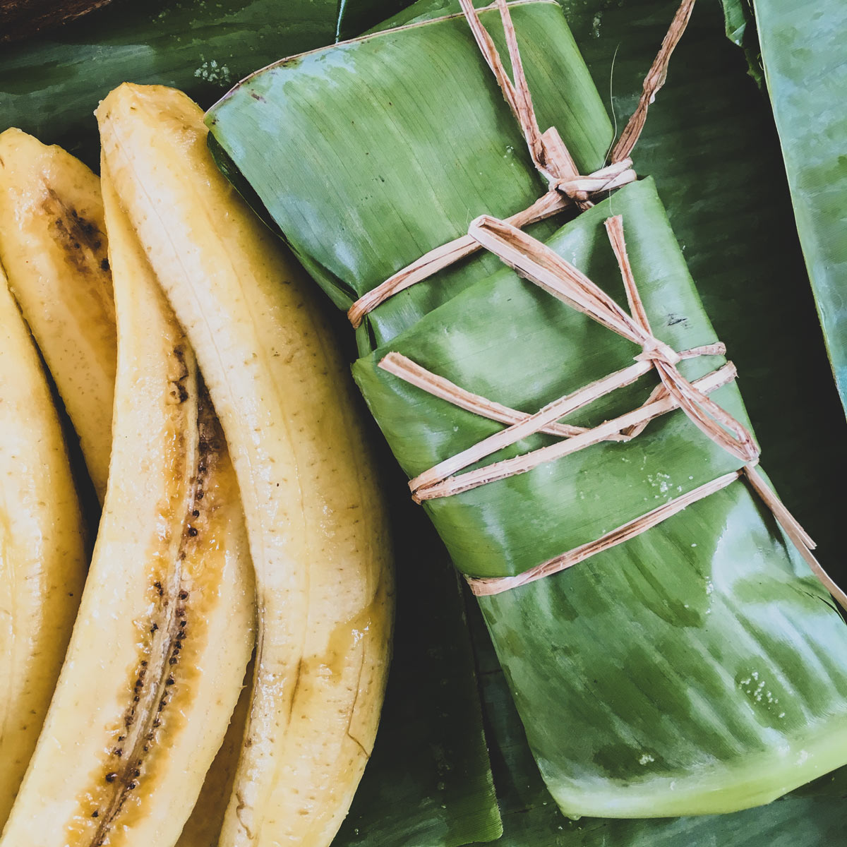 Banana and sticky rice wrapped in a banana leaf sit along side sliced raw bananas