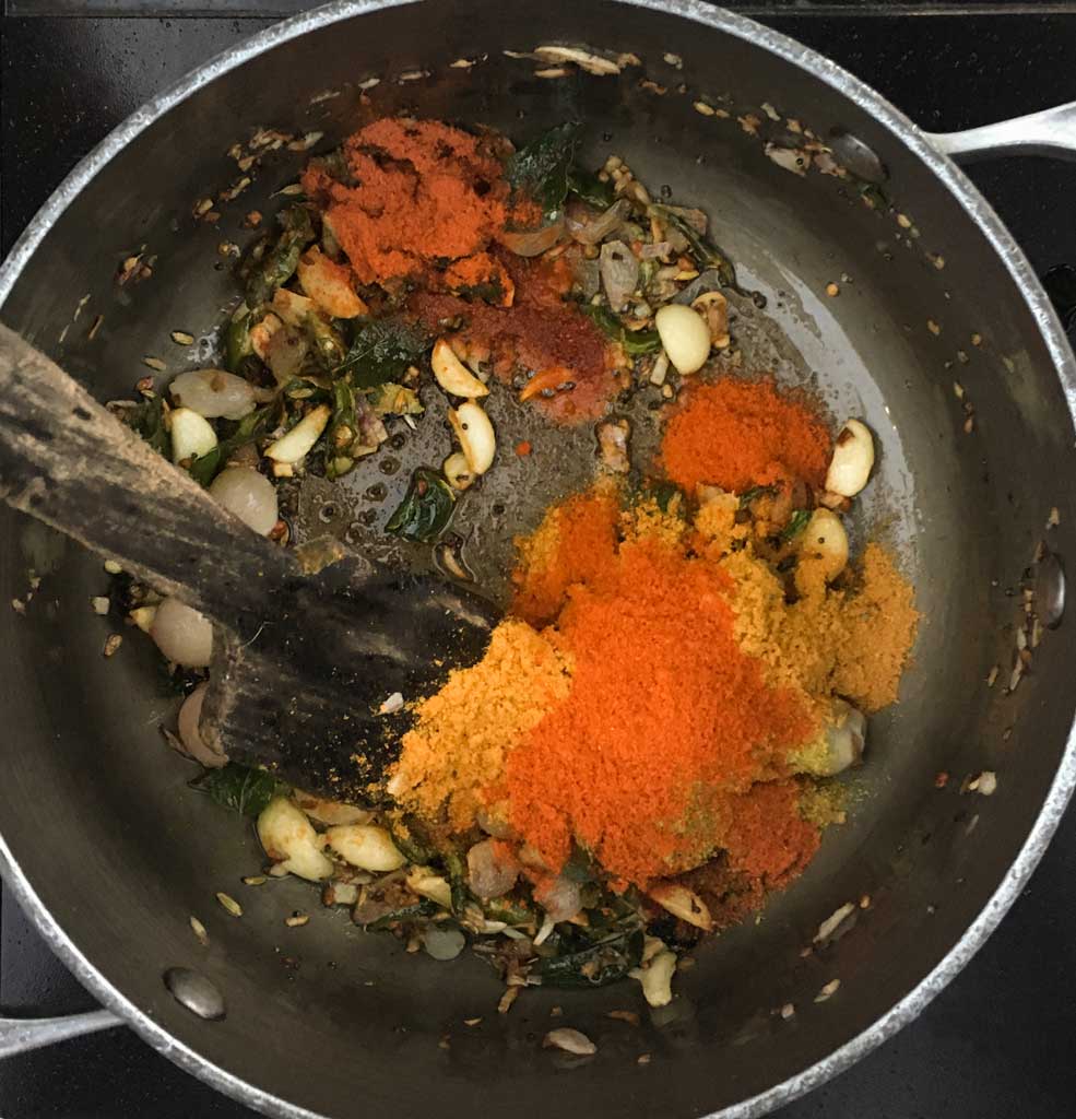 Heat the sesame oil in a kadai (wok) and add the mustard, fennel and fenugreek seeds and cook until the seeds pop and splutter in the pan.