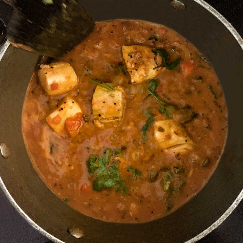 A Kozhambu (can also be spelled Kuzhambu) is a gravy that accompanies the main carbohydrate of a meal – or in this variation with fish – the protein.