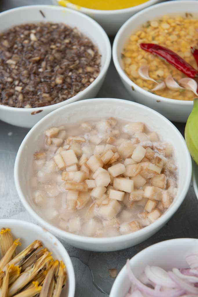 This recipe calls for raw green bananas which are abundant in South India. These are not the unripe version of North America’s “Chiquita” yellow banana. They are similar to what we can buy as unripe plantains. They are starchy and used as a vegetable instead of a fruit.
