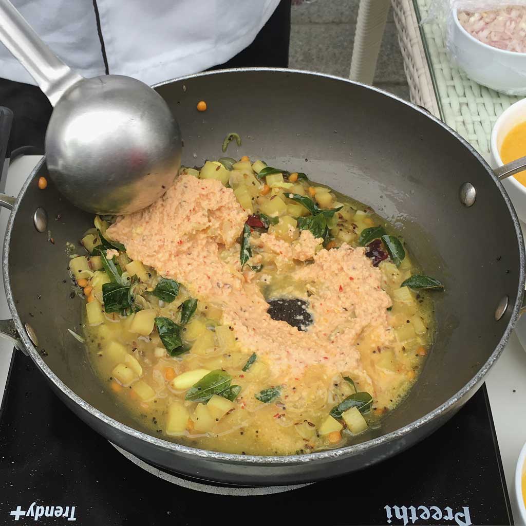 - Heat the coconut oil in a kadai (wok) and add the mustard seeds. After they pop and splutter, add the curry leaves, chana dal, and cumin seeds. After about 5 seconds add the garlic paste. Stir about 30 seconds then add the minced ginger and green chili paste and stir to mix well.