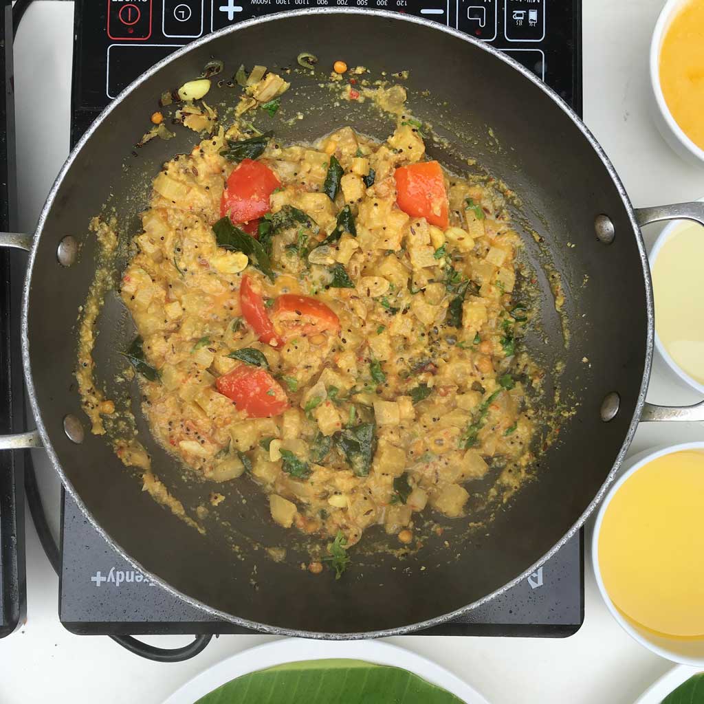 Kootus are a mix of vegetables and pulses cooked together and accented with coconut and other spices.