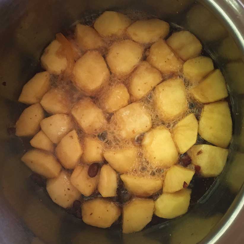 You then boil the jaggery bits in the water. Often, there will be residues so when using this form of jaggery, strain the liquid before continuing with the recipe. If you can’t find jaggery, you may substitute brown or demerara (turbinado) sugar.