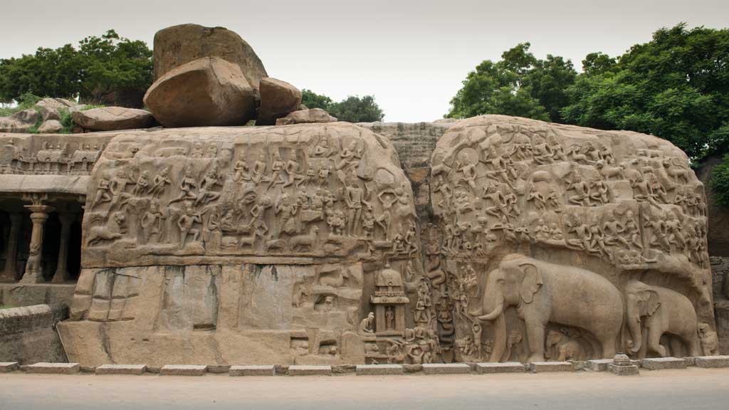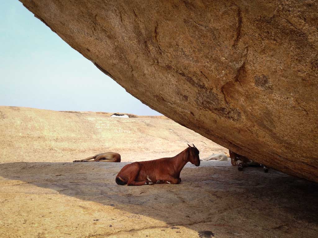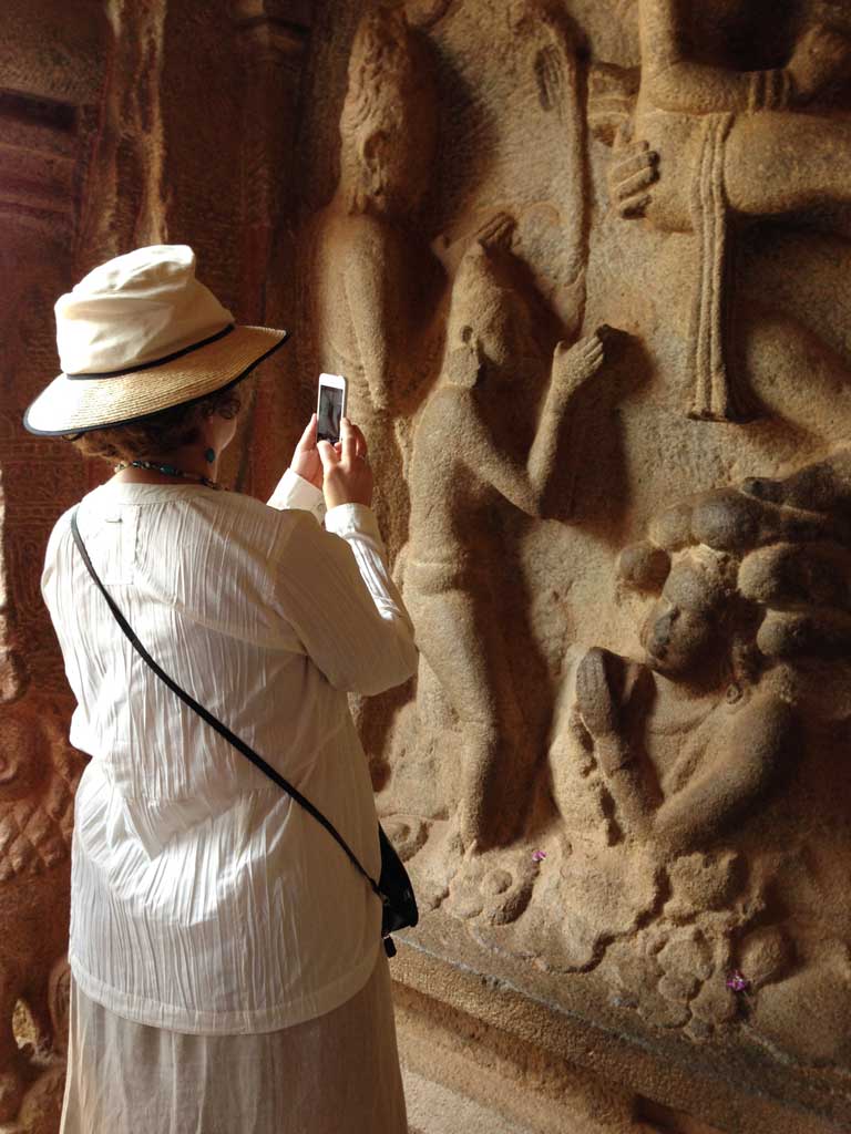 For our next destination, it seemed we travelled only one minute before arriving at a triple whammy of monuments: the bas-relief carvings at Ganges Descent (Arjuna’s Penance), the Varaha Mandapa (cave temple) and a 5 metre wide precariously perched granite stone called Krishna’s Butterball. A few steps south of Ganges Descent, there is also the sheltered colonnade structure of a monument called the Krishna Mandapa. Here you can actually touch the carvings of Krishna protecting cows and villagers. Arjuna’s Penance is fenced off but so large it is easily viewed. The butterball is just plain fun.