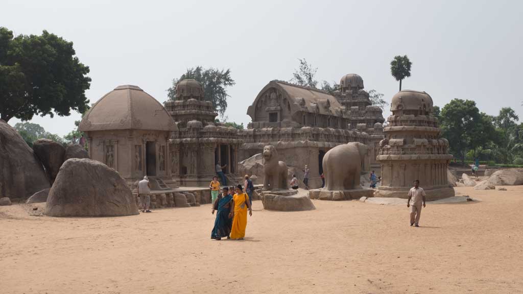 We got back on the bus and two minutes later we were at the Pancha Ranthas (five chariots). Here too we enjoyed peace and quiet as we wondered amongst the five temples carved like chariots and the large carvings of animals dispersed amongst them. A monolithic life size elephant was the group’s favourite. We took the time to wonder in and out of each shrine and to watch the keepers sweep and tend these ancient sculptures that were discovered after being buried in sand for over 1000 years.