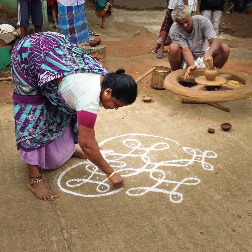 We visited the school there and learned that Travel XS supports their daily lunch, uniforms for the children who can’t afford them and the teacher’s salary. We found a potter and watched him spinning clay at his wheel, his masterful hands churning out at least a dozen objects from one original piece he started with. We learned about mandalas (welcome designs) outside of people’s homes.